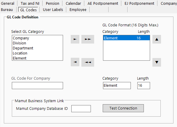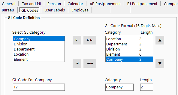 GL codes can be defined to include codes for the Company, Division, Department, Location and Element in any order using the GL Codes tab in Company Maintenance.