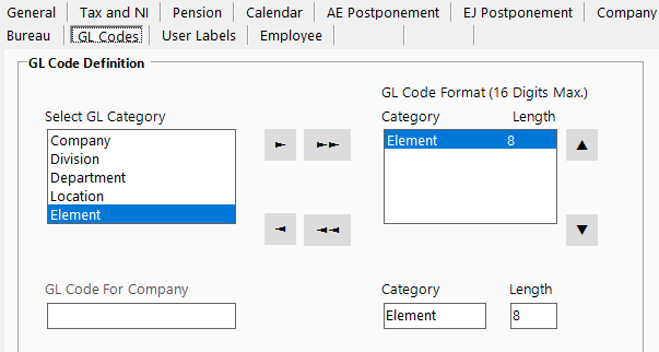 To add a business entity to the GL Code Format select a business entity from the left hand frame with a left click which will highlight the GL Category selected and then left click the single right hand arrow.