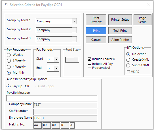 Once selected, you can then choose which pay frequency you wish to view, which periods, and at the bottom of the window you can add in the desired payslip message.